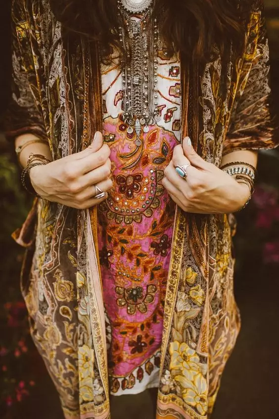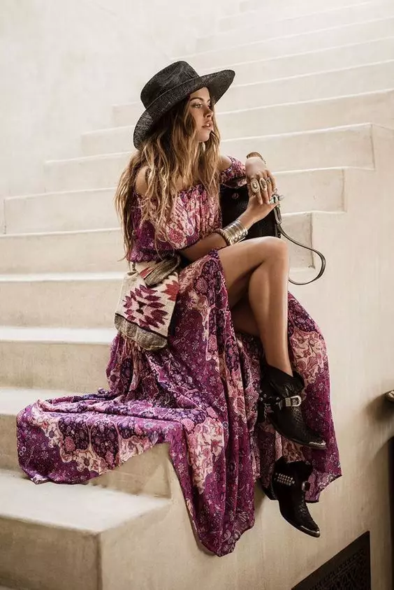 No quesito estampa e tecido, as estampas florais, étnicas e psicodélicas, o patchwork, suede, jeans, couro, tecidos fluidos, tricô e crochê, bordados, rendas, tons terrosos, linho e franjas compõem o outfit boho.